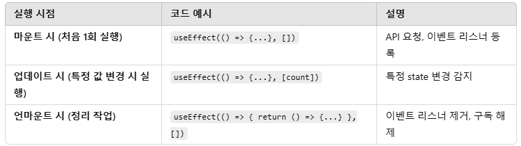📌 실행 시점: 컴포넌트가 사라질 때(unmount) 실행됨이벤트 리스너 제거, 타이머 해제, 구독 해제 등의 정리 작업(clean-up)이 필요할 때 사용